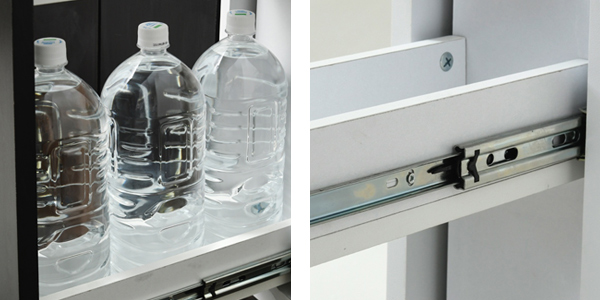 | 下段収納 下段には、2Lのペットボトルを3本収納可能です。他にも、瓶などの背の高い物の収納に利用できます。 | スライドレール 奥まで引き出せるフルスライドレールを採用しており、たっぷり収納しても取り出しやすいよう設計しています。 |