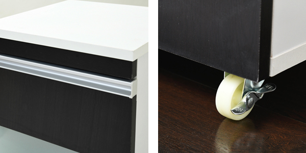 | お手入れしやすい 前板と天板には、水や汚れに強いPVCを採用していますので、水拭きできてお手入れが簡単です。 | キャスター キャスター付きラックなので簡単に移動ができ、キッチンの隙間へすっぽりと収めることができます。 |
