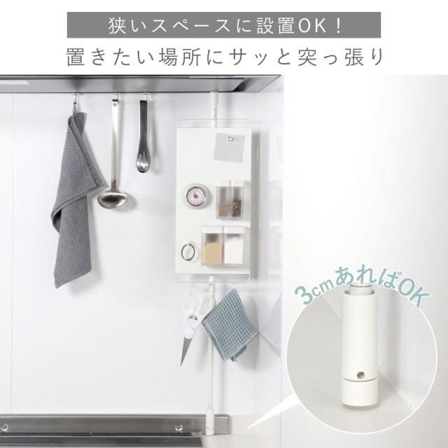 3cmのすき間があれば、工具不要で設置できる1本脚のキッチンつっぱりパネルです。シンプルなホワイトカラーのラックは、好きな空間に自由に設置できます。