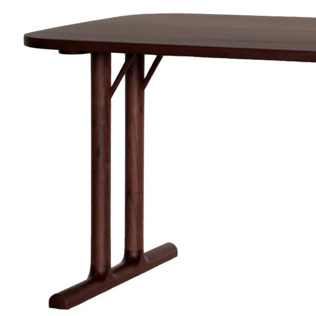 丸みを帯びた天板が優しい印象を与えてくれます。天板の縁を垂直に落とし、スッキリとしたデザインになっています。2本脚にすることでチェアやベンチからの立ち座り時にテーブルの脚が邪魔になりません。