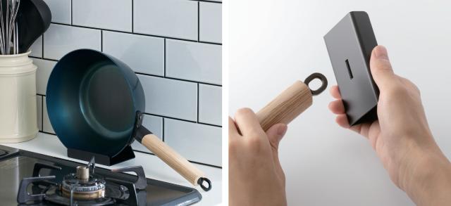 別売りの専用スタンドでコンロ脇に立てておけば場所をとらず、サッと使えて効率的です。また、スタンド底面の溝にハンドル先端のボルトをはめて回すと、軽い力でハンドルを着脱できます。