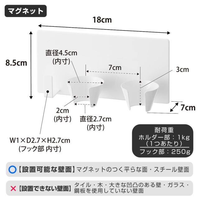 | サイズ | 約 幅18×奥行7×高さ8.5(cm) 内寸 ホルダー部:上部直径4.5cm・下部直径2.7cm・高さ3cm(1つあたり) フック部:幅1×奥行2.7×高さ2.7cm |