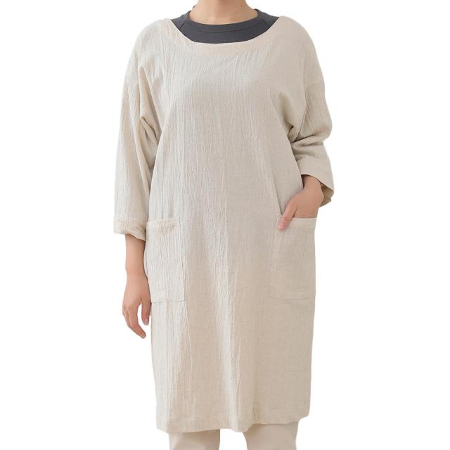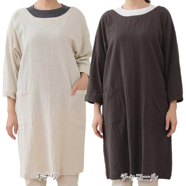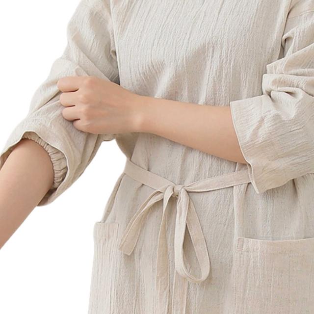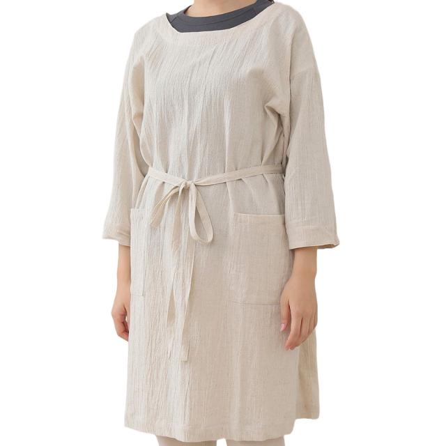 腰紐の着脱で2つのスタイルが楽しめて、ワンピースのようにカジュアルに着られる七分袖カッポウギです。カッポウギは上半身から膝丈まで布で覆うので、袖口だけでなく服全体を汚れから守ってくれます。ウォッシュド加工の柔らかさに加え、少し軽めの綿麻生地を使っているので、さらっとした着心地です。ゆったりとしたフォルムで身体のラインを拾わず、楽に着られます。