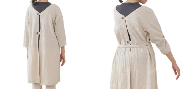 腰紐は着脱可能で2つのスタイルを楽しめます。腰紐をつけずにゆったりスタイルで楽に着たり、腰紐を結んですっきりシルエットにもできます。