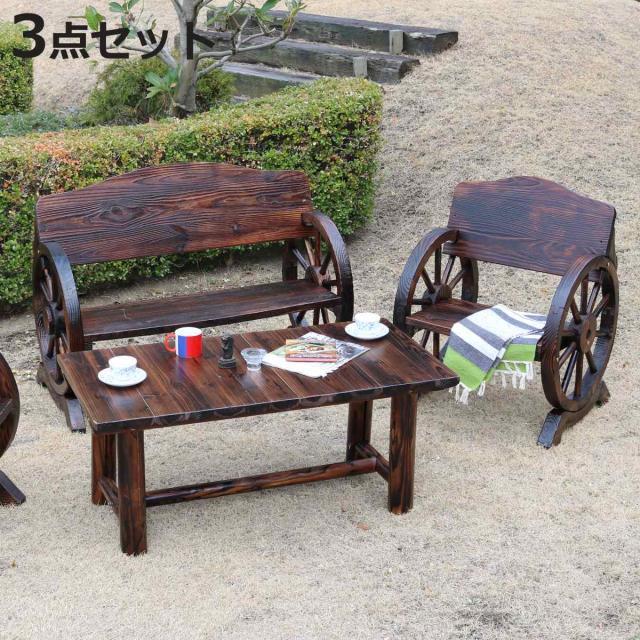 車輪ベンチ 大小 焼杉テーブル 3点セット ( テーブル ガーデンチェア ガーデン 庭 木 机 ベンチ 木製 セット 屋外 ウッドチェア ウッドテーブル バルコニー 天然木 杉 椅子 おしゃれ オブジェ ウッド )