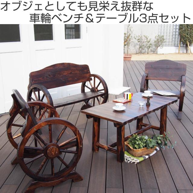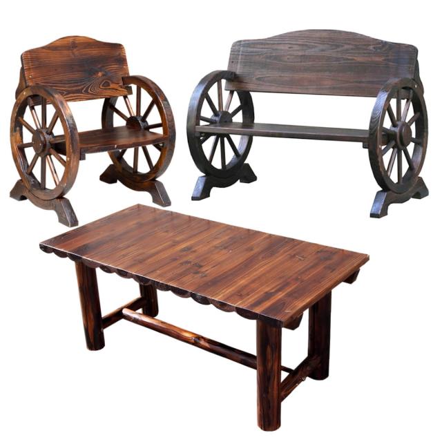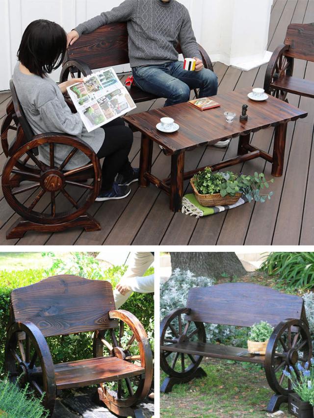 懐かしさを感じさせるノスタルジックな車輪ベンチセット