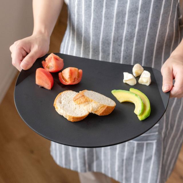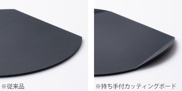 今や定番となった機能性バツグンのかまぼこ型まな板に、持ち手付きのデザインが登場しました。フチを少し折り曲げたような形状で、作業台とまな板の間に指が入りやすく、サッと持ち上げることができます。キッチンから食卓へ移動するときにも安定して運べます。