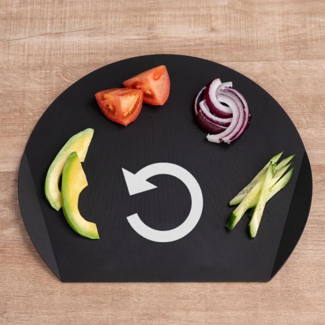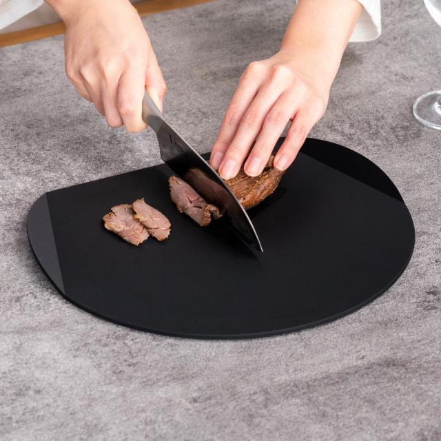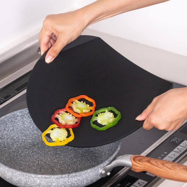 奥行きがあって広く使える丸型と、手前でスムーズに食材が切れる角型のいいとこどりをした形です。奥のスペースに切った食材を置いたまま次の食材をカットできるので、毎度お皿に移し替える手間がなく、洗い物も減らせます。