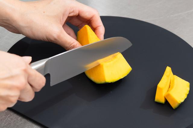 エラストマー素材は、木製のまな板のようなやわらかな刃あたりが特徴です。食材が滑りにくく刃がしっかりと入り込むので、お肉やお魚、カボチャなどの硬い食材にも安心して使うことができます。