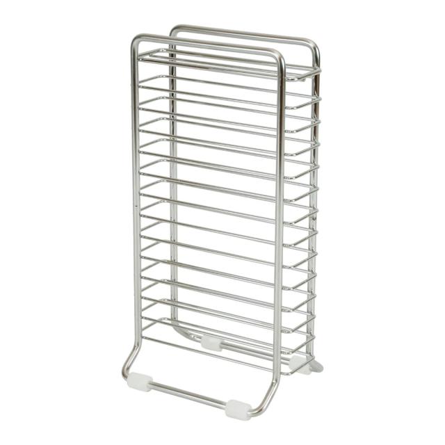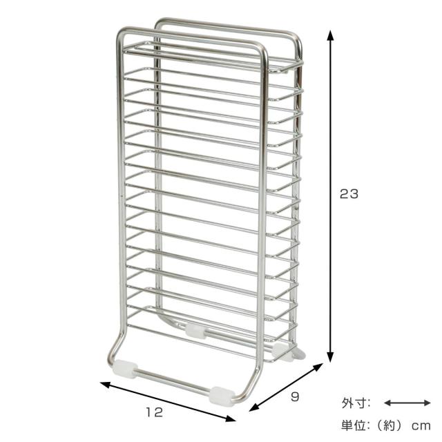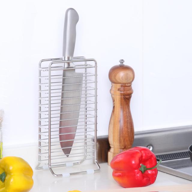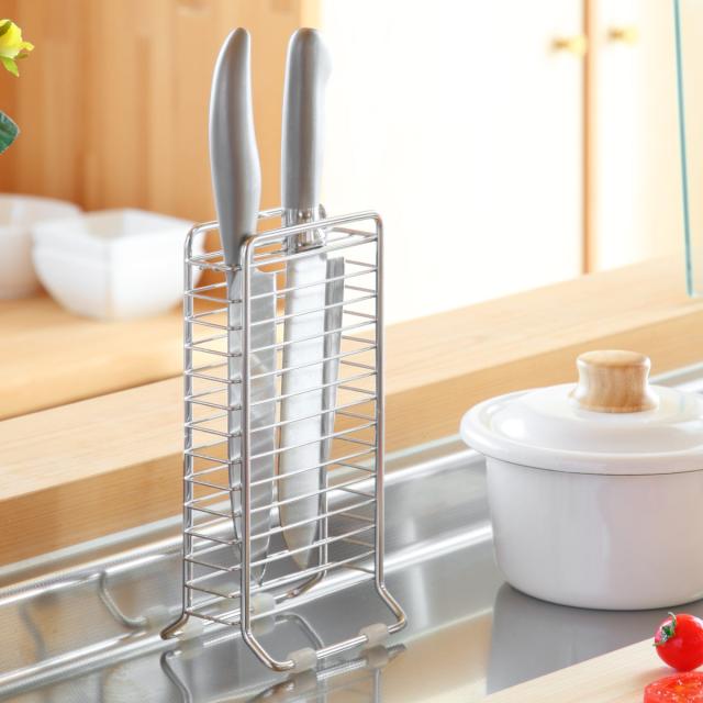 包丁を立てて省スペースに水切り・収納できるスタンドです。奥行が約9cmのスリム設計で、キッチンの作業台やコンロ横などのちょっとしたスペースにも設置できます。