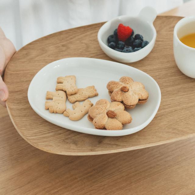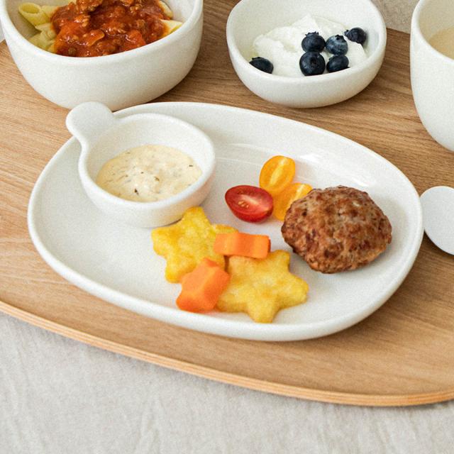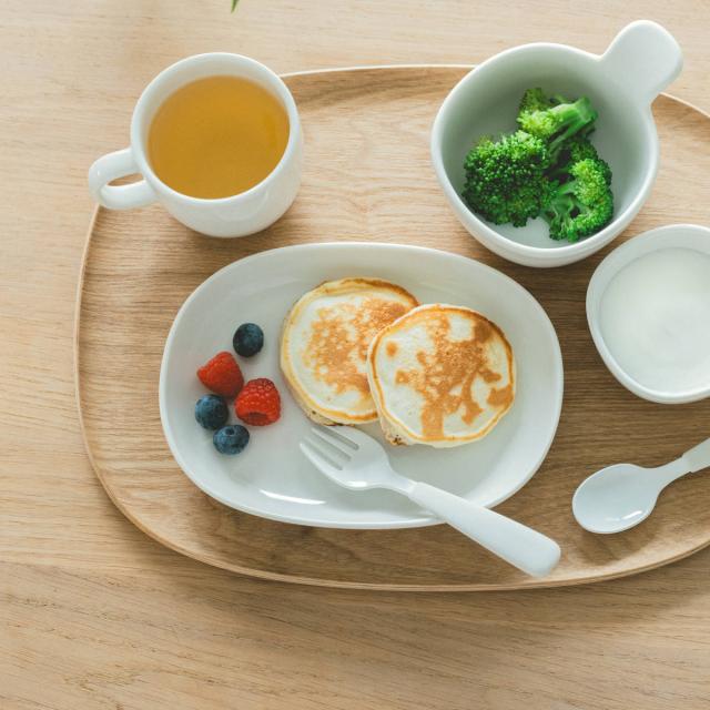 子供が手を添えたり大人が持って食べさせやすく、スプーンですくいやすい丸みを帯びたフォルムです。