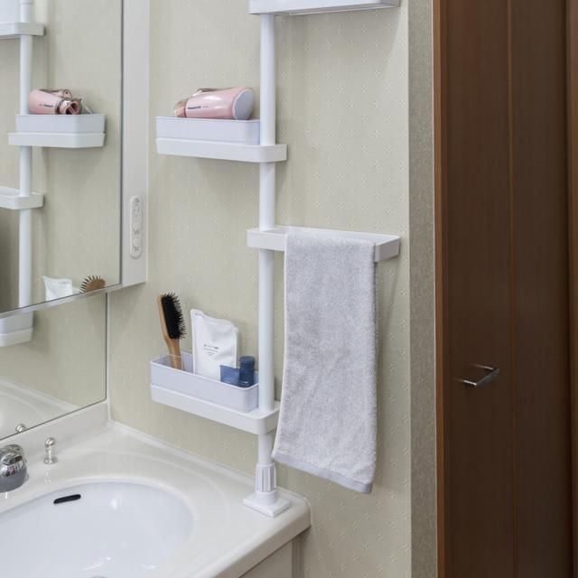 洗面台やカウンターの上を有効に活用できるスリムラックです。工事不要で手軽に設置できるので、賃貸住宅にお住まいの方にもおすすめです。