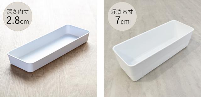 インナートレイは深さちがいで2種類。深さ2.8cmの浅型は、小さな物や背の低い物の収納に最適です。深さ7cmの深型は、倒れてしまいやすいボトルなどの収納にぴったり。用途に合わせてしっかり整理できます。