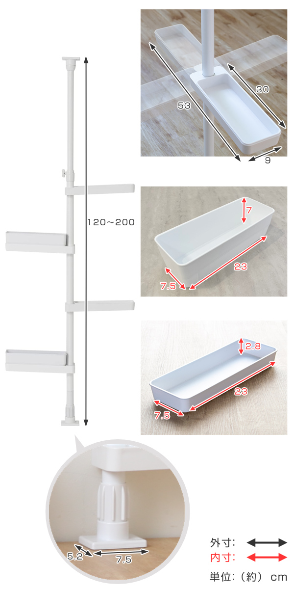 | サイズ | 約 幅9×奥行30×高さ120〜200(cm) 圧着板:約 幅7.5×奥行5.2(cm) 幅最大部展開時(トレイ):約 53(cm) |