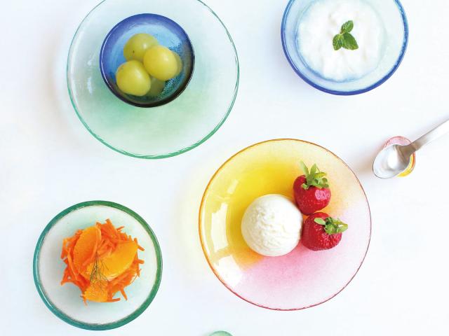 移ろいゆく空の色を表現したガラス食器、「空のいろどり」シリーズ。江戸硝子職人による手作りなので、毎日映す色を変える空のようにひとつひとつ違った表情が楽しめます。