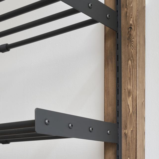 別売りのレールと、棚受や伸縮ラック、伸縮ハンガーを組み合わせて、自分好みの収納棚が作れます。さらに「ラブリコ」シリーズと組み合わせることによって、壁を大きく傷付けることなく大型の収納棚を設置でき、物が多いお家もスッキリ片付きます。