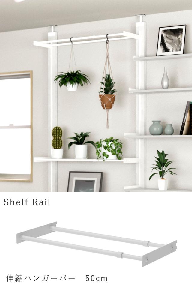 別売りのレールと、棚受や伸縮ラック、伸縮ハンガーを組み合わせて、自分好みの収納棚が作れます。さらに「ラブリコ」シリーズと組み合わせることによって、壁を大きく傷付けることなく大型の収納棚を設置でき、物が多いお家もスッキリ片付きます。