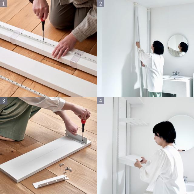 「ここに棚があったら…」を叶えるアイテムです。取り付ける幅を自分で決められるので、既製品では難しい中途半端なスペースにピッタリの収納が作れます。