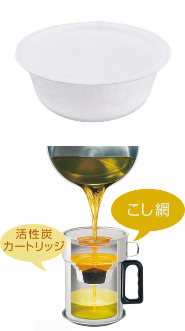 中に詰まった活性炭が油の不純物をろ過し、臭いや色を吸着。こし網だけの処理よりも、格段にきれいにすることができます。