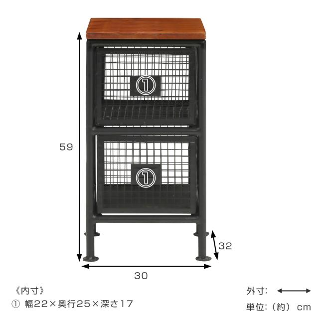 スチールメッシュ スリムチェスト 幅30cm 引出し2杯 木天板 完成品 ( チェスト スチール 引き出し 2杯 木製天板 棚 ラック 飾り棚 カゴ メッシュ ブラック )