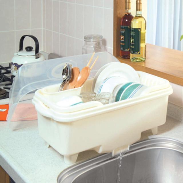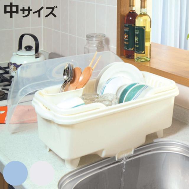 水切りカゴ 皿立て 水切り 流 フード付 中サイズ ( 水切りラック 水切りかご 洗い桶 シンク上 水切りバスケット フード付き フタ付き 蓋 カバー 洗い物 食器 洗い 収納 乾燥 ラック 水が流れる スリム コンパクト カトラリー )