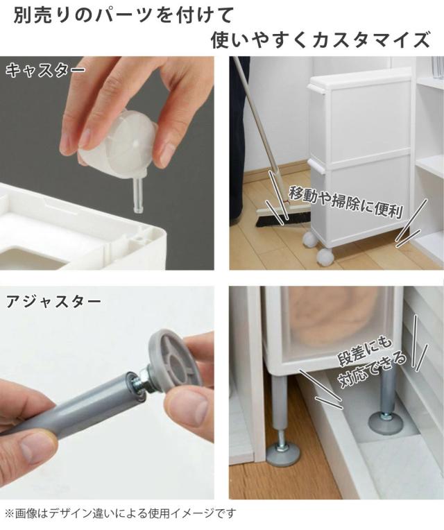 別売りでキャスターとアジャスターがございます。本体の差込穴に各パーツを差し込むだけなので、誰でも簡単に取付が可能です。