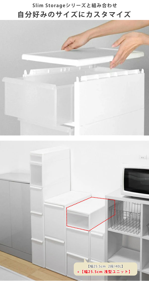 追加で段数を増やしたい方は、連結ユニットを組み合わせて、自由にカスタマイズができます。引き出しの色はホワイトと半透明、高さは4種類の中からお選びいただけます。