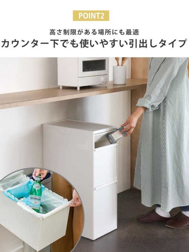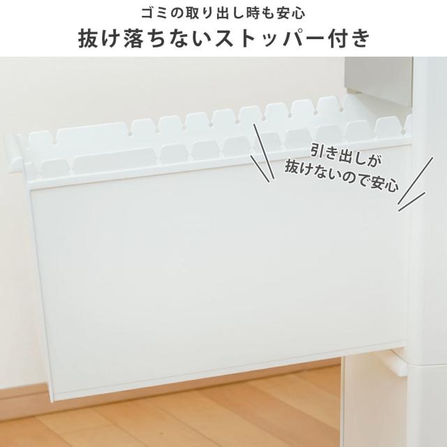 抜け落ちないストッパー付きの引き出しです。ゴミを取り出す時、うっかり勢いよく開けてしまっても、引き出しが抜けないので安心です。捨てる頻度が高いゴミは手前に、あまり出ないゴミは奥側に捨てることができます。