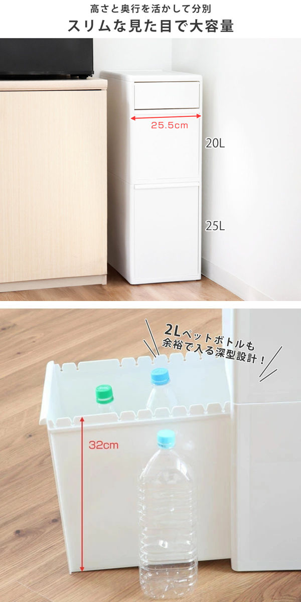 幅25.5cmとスリムな見た目ながら、しっかりゴミをストックできる安心の45Lのゴミ箱です。上段の容量は20L、下段は25Lです。下段は高さ約32cmの深型で、2Lのペットボトルも立てて入れることができます。奥行もあるため、たくさんのゴミが捨てられます。