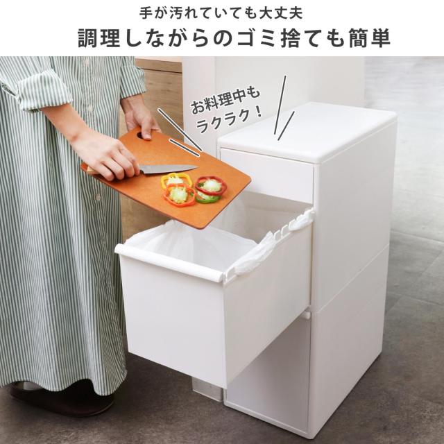 引き出したままでも抜け落ちないので、調理しながらのゴミ捨ても簡単。手が汚れた状態でふたの開け閉めをしなくてよいので、ストレスなく作業ができます。