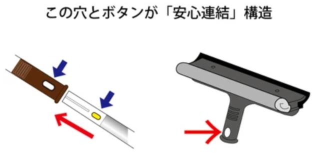 「アルミ伸縮柄 つなぎ柄セットLL554 柄のみ 高所清掃シリーズ」や、「安心連結」構造がついた柄にセット可能です。ボタンを押して抜き差しするだけで簡単に着脱できます 。