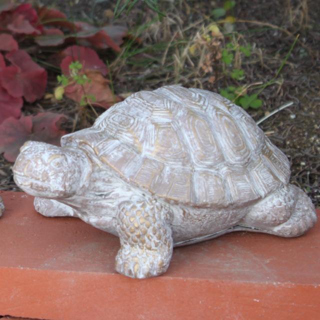 縁起物(長寿・安定・幸運)としても親しまれるカメをモチーフにしたガーデンオーナメントです。セメントならではの重厚感とアンティーク調のゴールドの風合いが、ナチュラルで落ち着いた存在感を演出します。