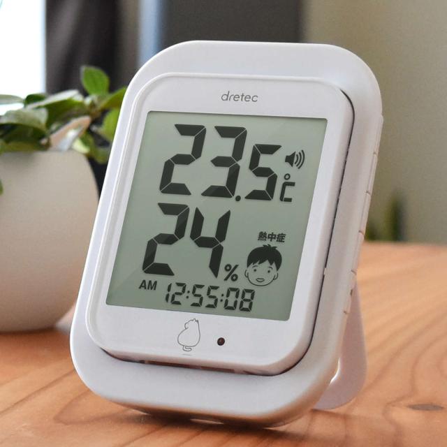 置き場所を選ばず使える、無駄のないシンプルなデザインの温湿度計です。熱中症の危険度を表情アイコン・アラーム音・ランプでわかりやすく知らせてくれ、快適な室内環境づくりをサポートします。
