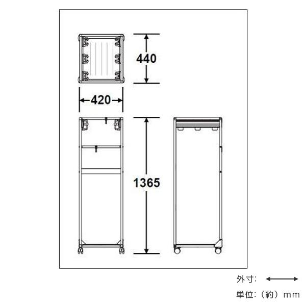 | スライド式フック 小物を吊り下げるのに便利なフックです。左右にスライドするので、モップの柄などが邪魔にならないところに自由に移動できます。 | 移動に便利なキャスター 2箇所にストッパー付きで運搬や設置(固定)ができます。 ※キャスター直径:約5cm |