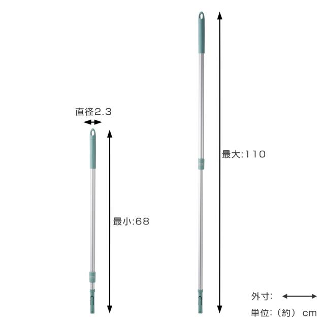 最長110cmまで無段階で伸縮できるため、使う場所に合わせてちょうど良い長さでお掃除できます。軽くて丈夫なアルミ製のため、腕への負担も少なく、快適に作業を進められます。