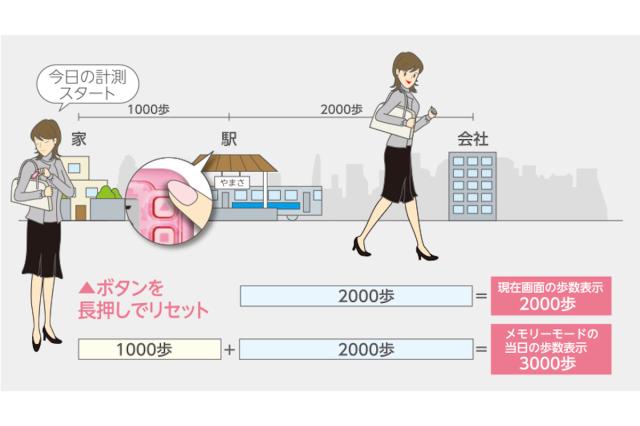 通勤時のみの歩数を知りたい時も、ウォーキングの間だけの歩数を知りたい時も、簡単な操作で計測出来ます。