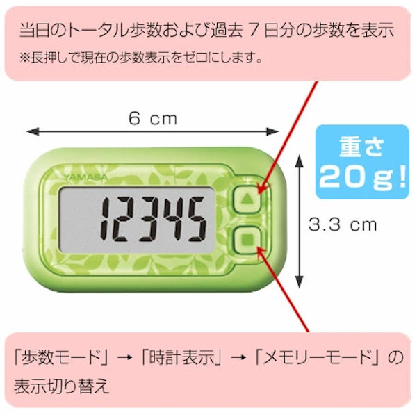 《 LH15235 LH15243 まんぽけい ほすうけい カロリー消費 消費カロリー 時間 とけい 健康 健康保持 運動 散歩 ウォーキング ジョギング ランニング マラソン メモリー きろく 7日分 一週間分 小さい 軽い ボタン操作 しんぷる 可愛い カワイイ 簡単 山佐 ヤマサ グリーン 緑 みどり ホワイト 白 しろ 》
