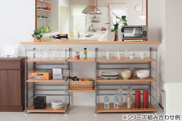 飾り棚的な役割はもちろん、強度があるので、書籍のような重さのある物も置くことができます。キッチンに設置して、食器類や家電製品などを収納していただくのもおすすめです。扉がないことで物の出し入れがスムーズで、食品のストックも一目瞭然、目当ての物をすぐに見つけることができます。