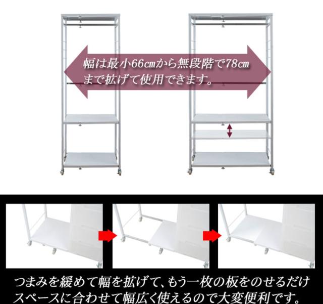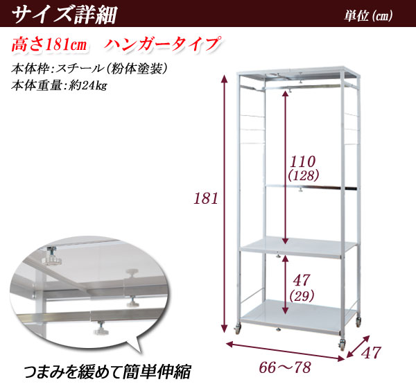 | サイズ | 本体:約 幅66〜78×奥行47×高さ181(cm) ハンガー下高さ/棚板上部セット時:約 上110下47(cm)、棚板下部セット時:約 上128下29(cm) |