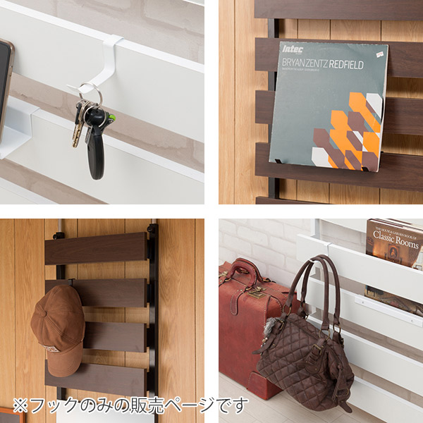 立体ラダーラック専用のフック6個入りです。玄関やリビングに設置した立体ラダーにフックを追加すれば、収納力がさらにアップします。鍵や帽子、CDなどを収納するのに最適です。