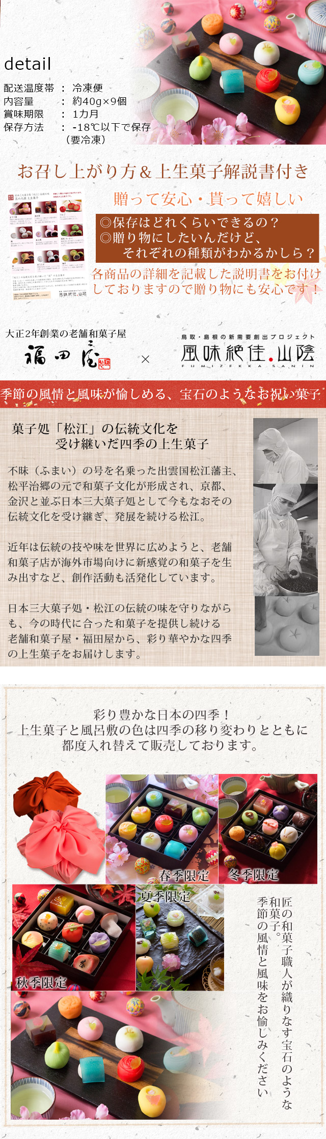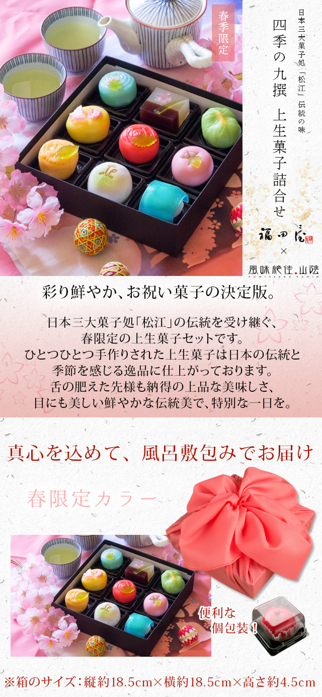 彩り鮮やかな上生菓子は日本三大菓子処「松江」伝統の味。食べてしまうのがもったいないほど美しい、宝石のような和菓子を風呂敷包みでお届けします。匠の和菓子職人が織りなす、季節の風情と風味をお愉しみください。