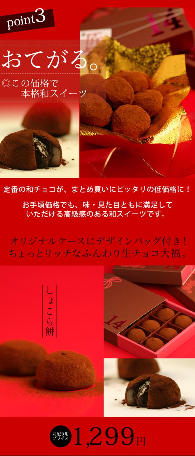 毎年脅威の販売個数を記録している「しょこら餅」。ぷるんぷるんのおもちでたっぷりのとろ〜り生チョコレートを包みました。和テイストのオリジナルケースに、そのまま渡せるデザインバッグ付き。会社・職場向け義理チョコの大量まとめ買いや友チョコなど、お配り用のバレンタインチョコにもおすすめ。[バレンタイン チョコ チョコレート2026 valentine 義理チョコ 本命チョコ 友チョコ 和チョコ 人気 職場 会社 かわいい おもしろ ギフト プレゼント]