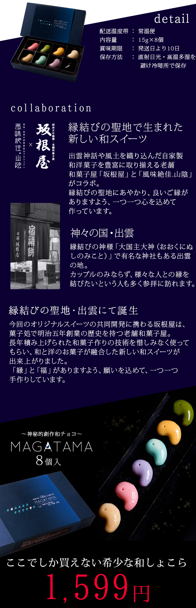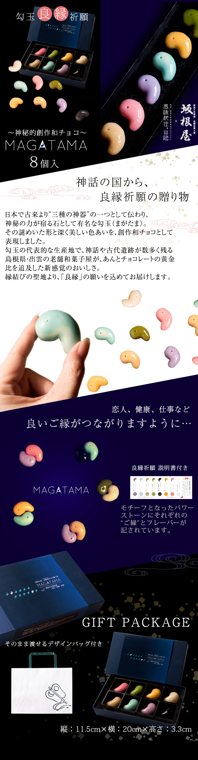日本で古来より“三種の神器”の一つとして伝わり、神秘の力が宿る石として有名な勾玉(まがたま)。その謎めいた形と深く美しい色あいを、創作和チョコとして表現しました。勾玉の代表的な生産地で、神話や古代遺跡が数多く残る島根県・出雲の老舗和菓子屋が、あんとチョコレートの黄金比を追及した新感覚のおいしさ。縁結びの聖地より、「良縁」の願いを込めてお届けします。会社・職場向け義理チョコの大量まとめ買いや友チョコなど、お配り用のバレンタインチョコにもおすすめ。[バレンタイン チョコ チョコレート2026 valentine 義理チョコ 本命チョコ 友チョコ 和チョコ 人気 職場 会社 かわいい おもしろ ギフト プレゼント]