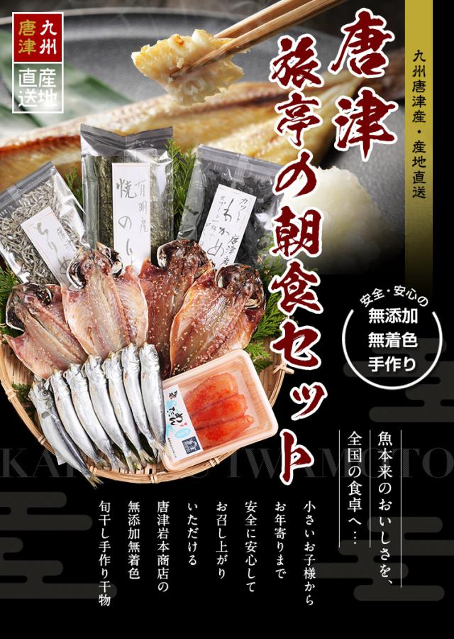 【敬老の日 ギフト】【送料無料】 唐津/佐賀 名産 旅亭の朝食セット 唐津産旬アジ 醤油みりん/淡汐干し 有明産焼き海苔 無添加メンタイコ 真イワシ丸干し 唐津産ちりめん 唐津産カットワカメ 干物 ひもの セット プレゼント