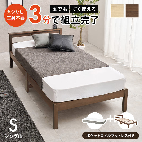 ベッド ベッドフレーム マットレス付き シングル すのこベッド シングルベッド すのこ コンセント付き ポケットコイル 組み立て簡単 ネジレスライト 簡単組立 工具不要 ベット 新生活 引っ越し 移動 棚