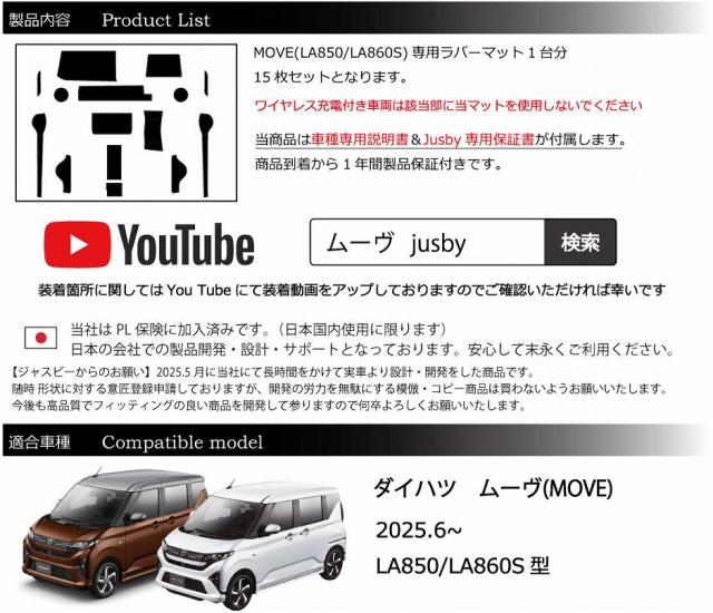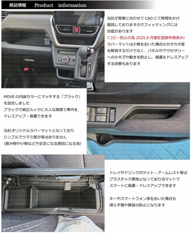 | ムーヴ(MOVE) LA850/LA860S型) インテリアラバーマット (ブラック)です 2025年6月発売のダイハツ用 ムーヴ(MOVE) LA850/LA860S型)専用 インテリアラバーマット(ブラック) 15枚セットです。 内装のプラスチック素地むき出しの助手席前トレイやコンソールポケット等を当マットで保護&ドレスアップ可能です。 ブラックタイプとなっており、主張することなく純正ルックに大人な質感で違和感なく装着可能です(別途ブラウンタイプも販売中です) スマートフォン等を置く場合等運転中のカタカタ音の防止やパネルへの傷防止、ドレスアップに最適です 全15枚セットで全てのグレードに適合致します。 MOVEは車内が非常に静かな事もあり小物が動いた際などパネルと干渉・異音等が発生しやすい為 是非当マットで保護&ドレスアップをお勧めいたします。新車からの早めの装着がオススメです 注意事項 ・ ワイヤレス充電装着車は該当部には当マットを使用しないでください(無線充電が遅くなったり長期的にマット変形や機器の故障等の可能性がある為) ・その他重要な注意事項が取説に記載がございます 取説を熟読の上ご使用をお願いいたします 車種専用取付説明書&製品保証書が付属いたします。 1年間は不具合・不適合・初期不良に対しての製品保証を行いますのでご安心してお買い求めください 発送に伴う破損や紛失は当社にて補償いたしますのでご安心ください Jusbyオリジナル商品ですデッドコピー防止の為、意匠登録申請済みです (特許庁HPにてご確認ください)デッドコピーには「業者」及びコピー目的での購入者「個人」へ請求させていただきます スタッフレビュー 専用設計なのでフィッティングがとにかく良く、純正の様に見えます 携帯電話等車で充電しながらそのまま置いていた部分にもラバーマットで保護できる為、携帯電話及び車両パネルにも優しく 満足度が高い逸品です。また純正のドアポケット部等はプラスチックやビスが丸見えの部分があり目隠しもできグレードがワングレードアップしたような質感になりますのでオススメです。 |