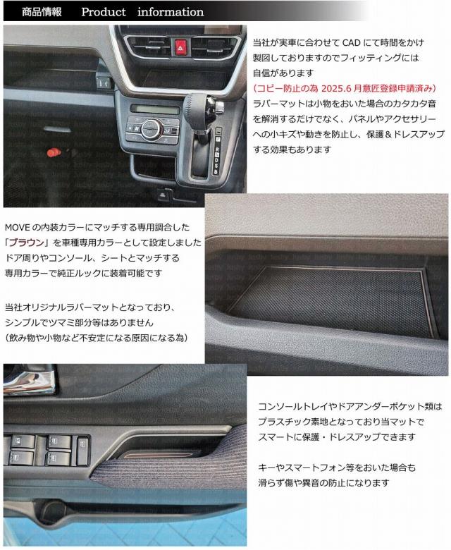 | ムーヴ(MOVE) LA850/LA860S型) インテリアラバーマット (ブラウン)です 2025年6月発売のダイハツ用 ムーヴ(MOVE) LA850/LA860S型)専用 インテリアラバーマット(ブラウン) 15枚セットです 内装のプラスチック素地むき出しの助手席前トレイやコンソールポケット等を当マットで保護&ドレスアップ可能です 車両内装に合わせて調合した専用ブラウンカラーで内装に違和感なく装着可能です(別途ブラックも販売しています) スマートフォン等を置く場合等運転中のカタカタ音の防止やパネルへの傷防止、ドレスアップに最適です 全15枚セットで全てのグレードに適合致します。 MOVEは車内が非常に静かな事もあり小物が動いた際などパネルと干渉・異音等が発生しやすい為 是非当マットで保護&ドレスアップをお勧めいたします。新車からの早めの装着がオススメです 注意事項 ・ ワイヤレス充電装着車は該当部には当マットを使用しないでください(無線充電が遅くなったり長期的にマット変形や機器の故障等の可能性がある為) ・その他重要な注意事項が取説に記載がございます 取説を熟読の上ご使用をお願いいたします 車種専用取付説明書&製品保証書が付属いたします。 1年間は不具合・不適合・初期不良に対しての製品保証を行いますのでご安心してお買い求めください 発送に伴う破損や紛失は当社にて補償いたしますのでご安心ください Jusbyオリジナル商品ですデッドコピー防止の為、意匠登録申請済みです (特許庁HPにてご確認ください)デッドコピーには「業者」及びコピー目的での購入者「個人」へ請求させていただきます スタッフレビュー 専用設計なのでフィッティングがとにかく良く、純正の様に見えます 携帯電話等車で充電しながらそのまま置いていた部分にもラバーマットで保護できる為、携帯電話及び車両パネルにも優しく 満足度が高い逸品です。また純正のドアポケット部等はプラスチックやビスが丸見えの部分があり目隠しもできグレードがワングレードアップしたような質感になりますのでオススメです。 |
