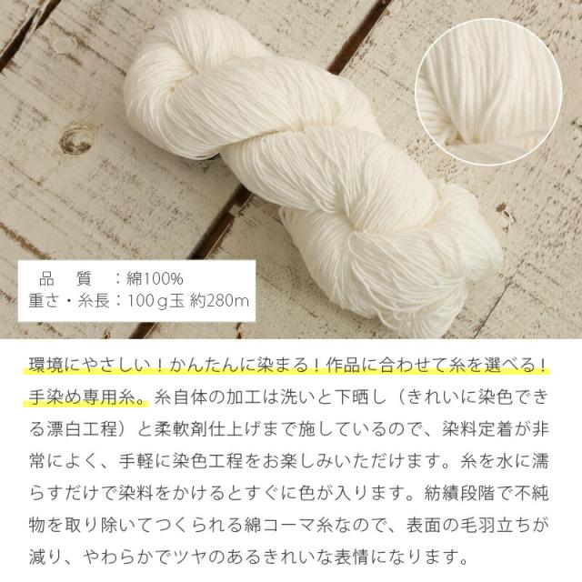 | ・糸自体の加工は洗いと下晒し(きれいに染色できる漂白工程)と柔軟仕上げまで施しているので、染料定着が非常によく、手軽に染色工程をお楽しみいただけます。 ・糸を水に濡らすだけで、染料をかけるとすぐに色が入ります。 ・紡績段階で不純物を取り除いてつくられる綿コーマ糸なので、表面の毛羽立ちが減り、やわらかでツヤのあるきれいな表情になります。 | |