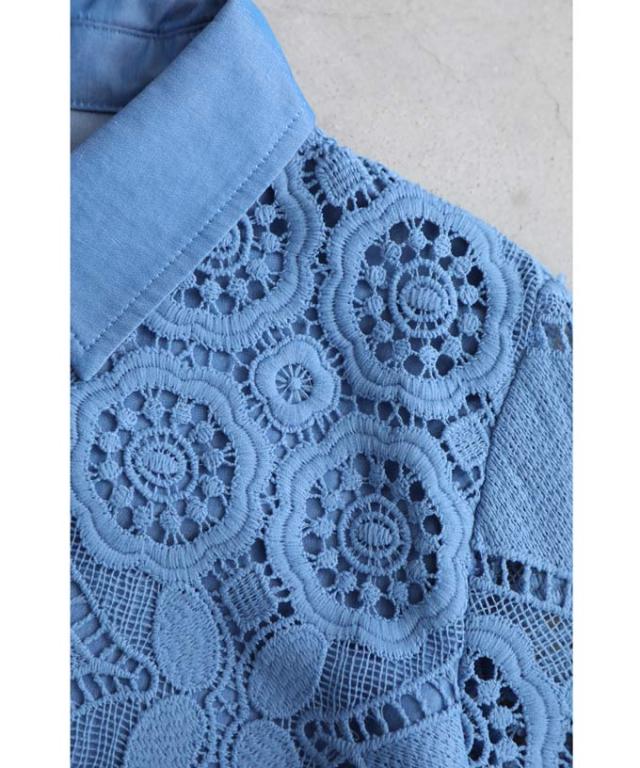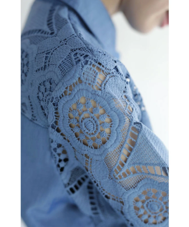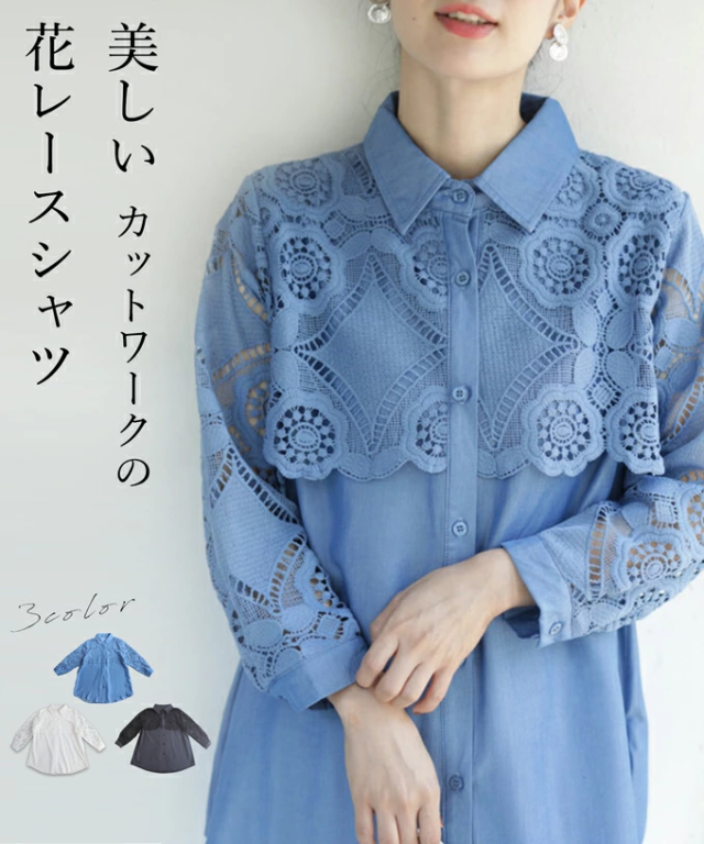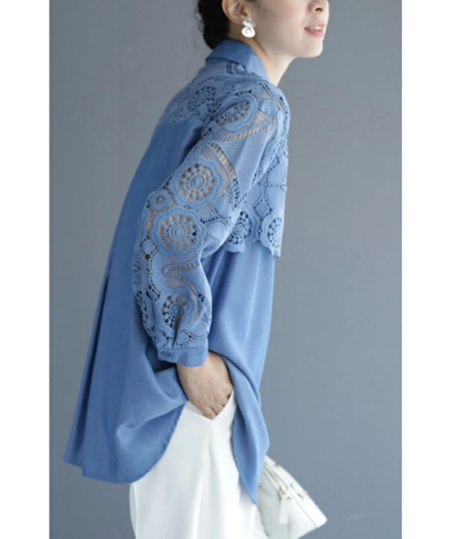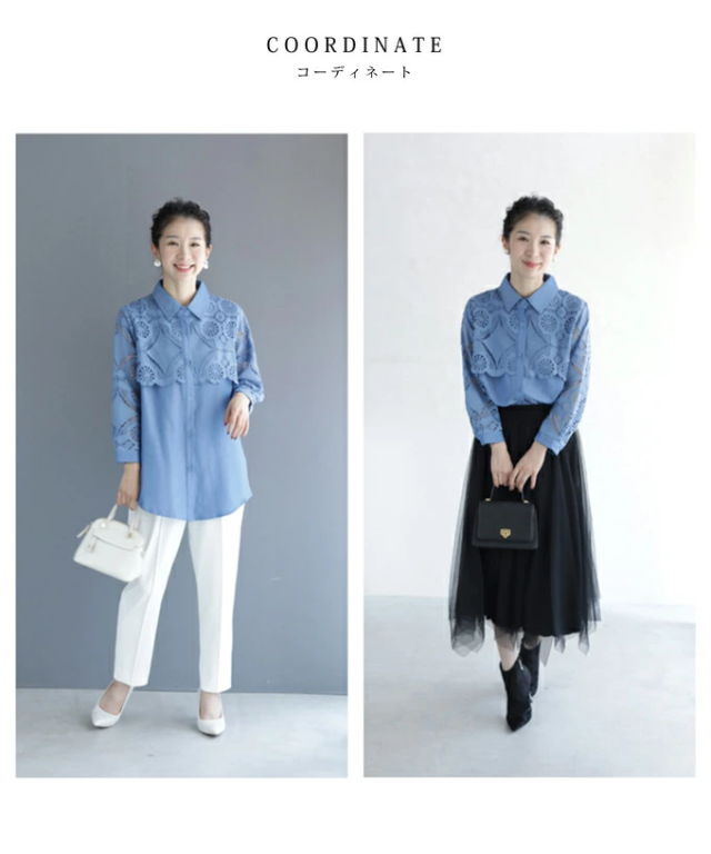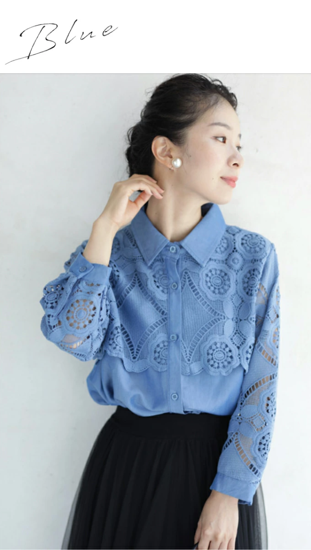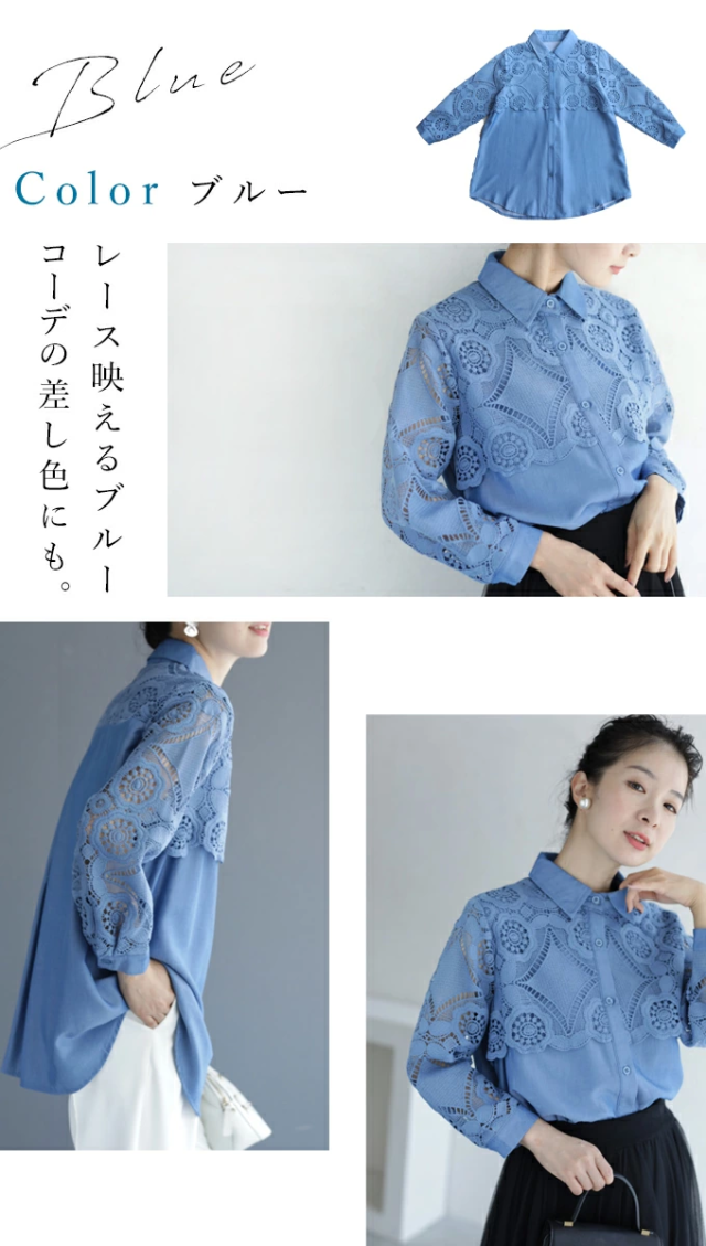 w50037nc 新作 新着 再入荷 CAWAII FRENCHPAVE フレンチパヴェ エレガント ベーシック カジュアル 可愛い かわいい カワイイ おしゃれ オシャレ お洒落 個性 個性的 定番 ベーシック 大人かわいい 大人可愛い 上品 女性らしい デザイン スタンダード ナチュラル きれいめ キレイめ シンプル フェミニン レディース レディースファッション 大人 ママ ミセス 30代 40代 50代 60代 美しい カットワーク 花レース シャツ トップス 半端袖 七分袖 八分袖 S M L 2L LL XL フリーサイズ フリー 小さめ 小さめサイズ小さい 小さいサイズ 低身長 痩せ ほっそり 小柄 細身 標準サイズ F サイズ自由 ゆったり 春 夏 秋 春服 春物 夏 夏服 夏物 秋服 秋物 体型カバー 体型隠し 体型隠れる お尻隠し 太もも隠し お腹隠し 隠れる 着痩せ 細見え ブルー 青 水色 日常着 普段着 日常使い デニム