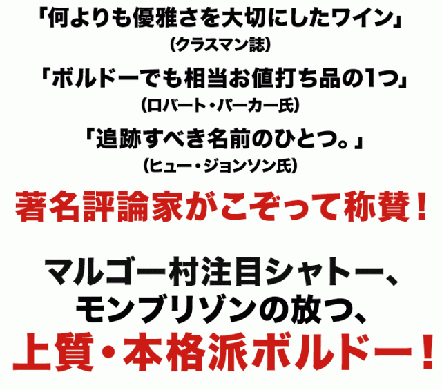 「モンブリゾンの品質と、リーズナブルな価格設定は、このワインをボルドーでも相当お値打ち品の1つにしている。」(ワイン・アドヴォケイト誌 ロバート・パーカー氏)